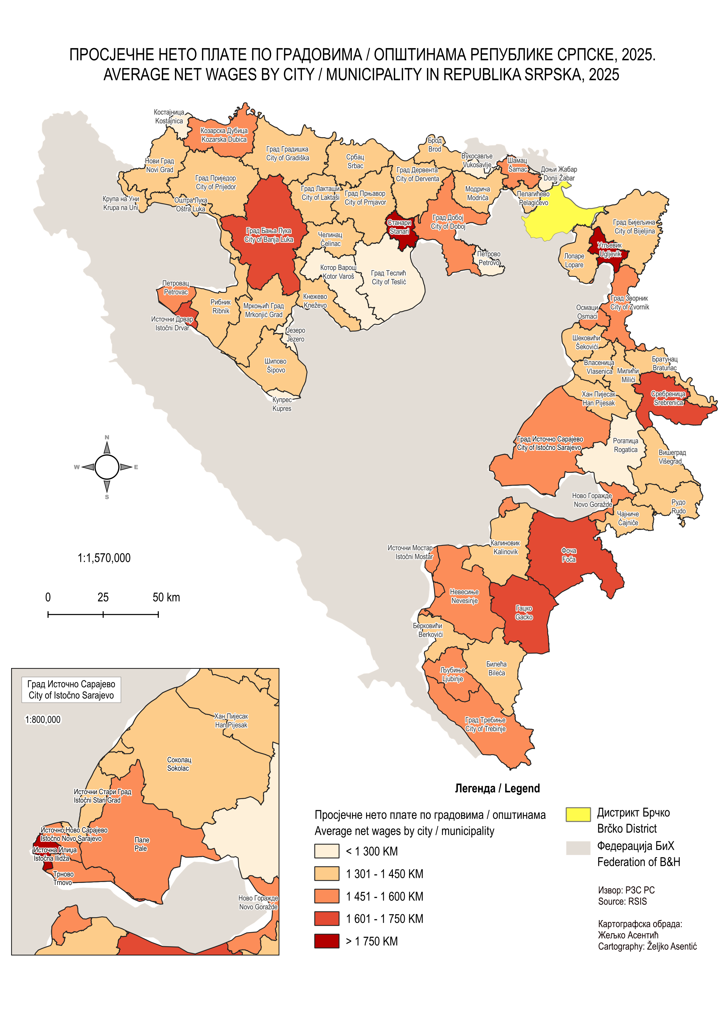 Просјечне нето плате по градовима и општинама Републике Српске, 2025.