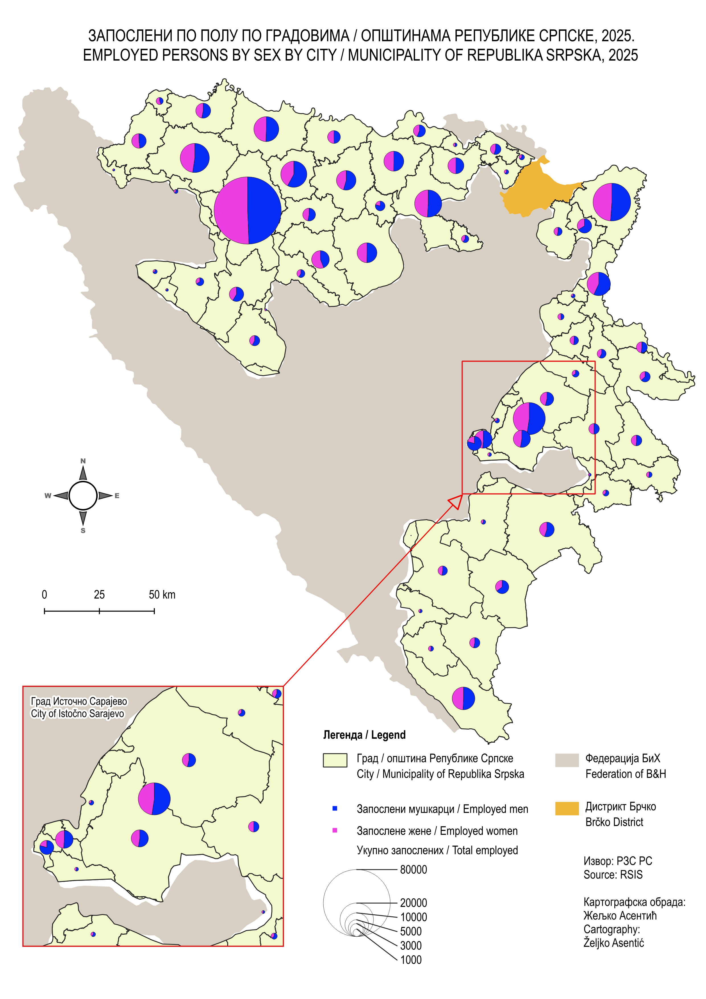 Запослени по полу по градовима и општинама Републике Српске, 2025.
